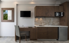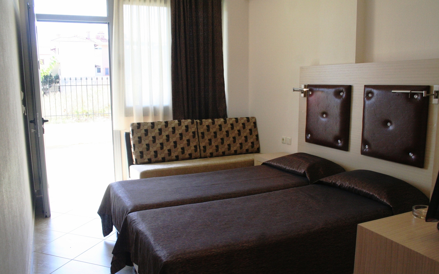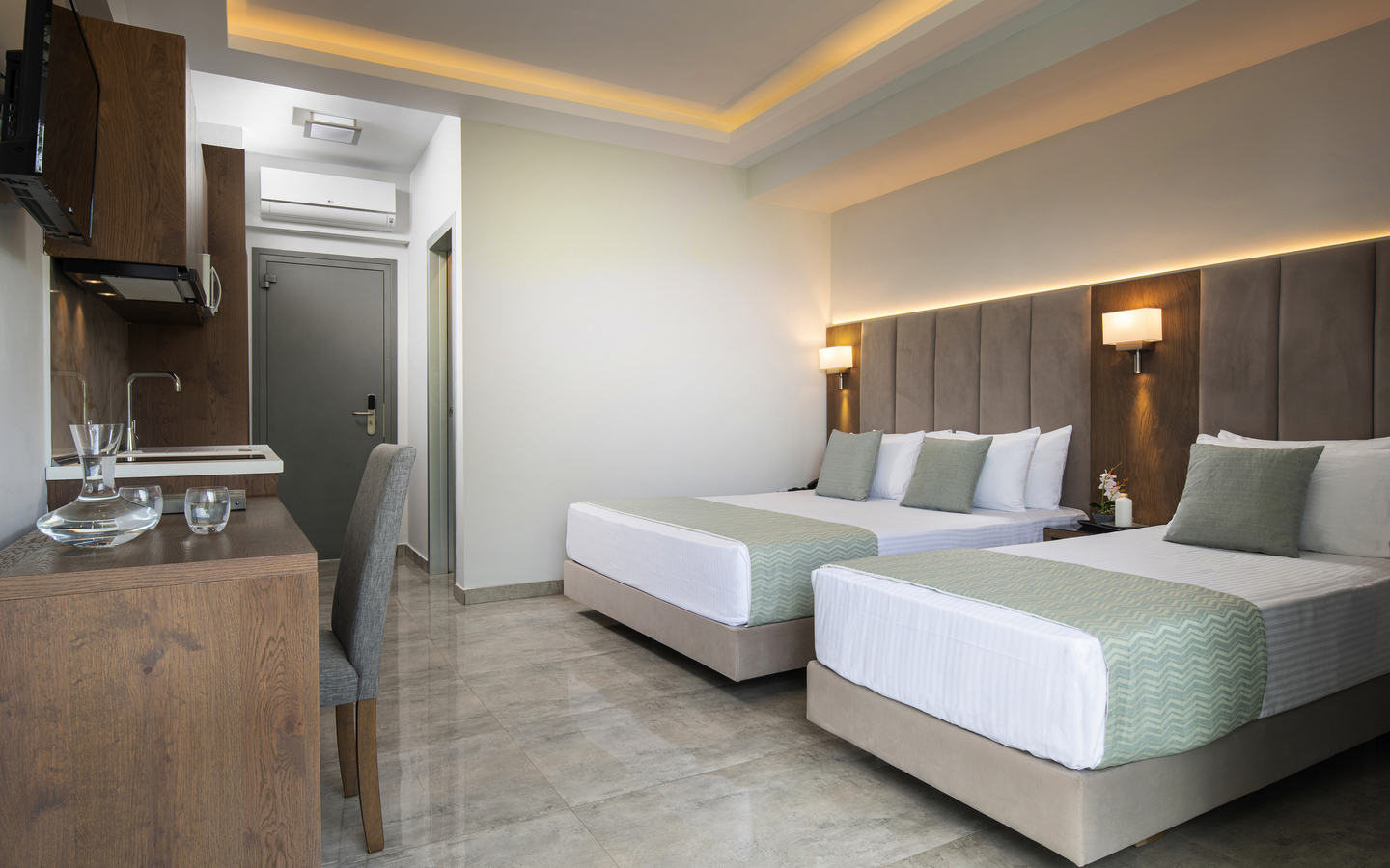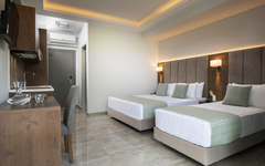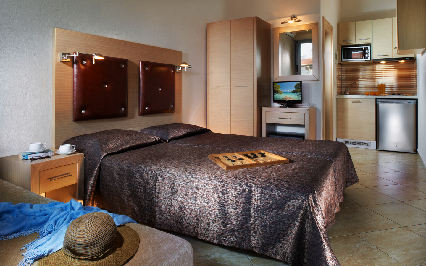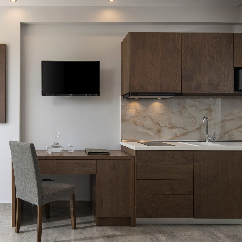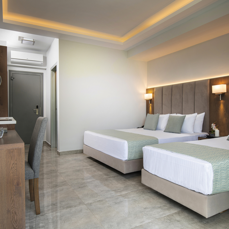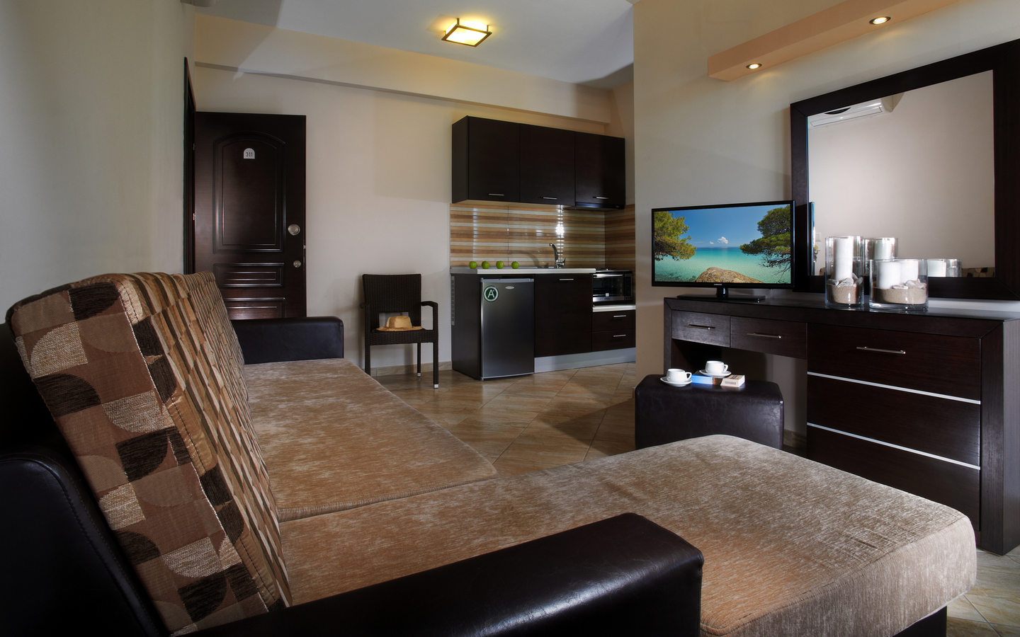 Geräumige, schöne Studios mit Kochnische, Klimaanlage, Bad oder Dusche/WC, TV und Balkon oder Terrasse. Die Apartments sind größer.