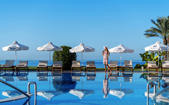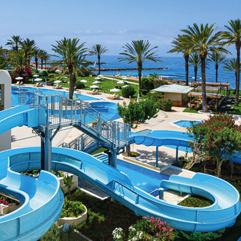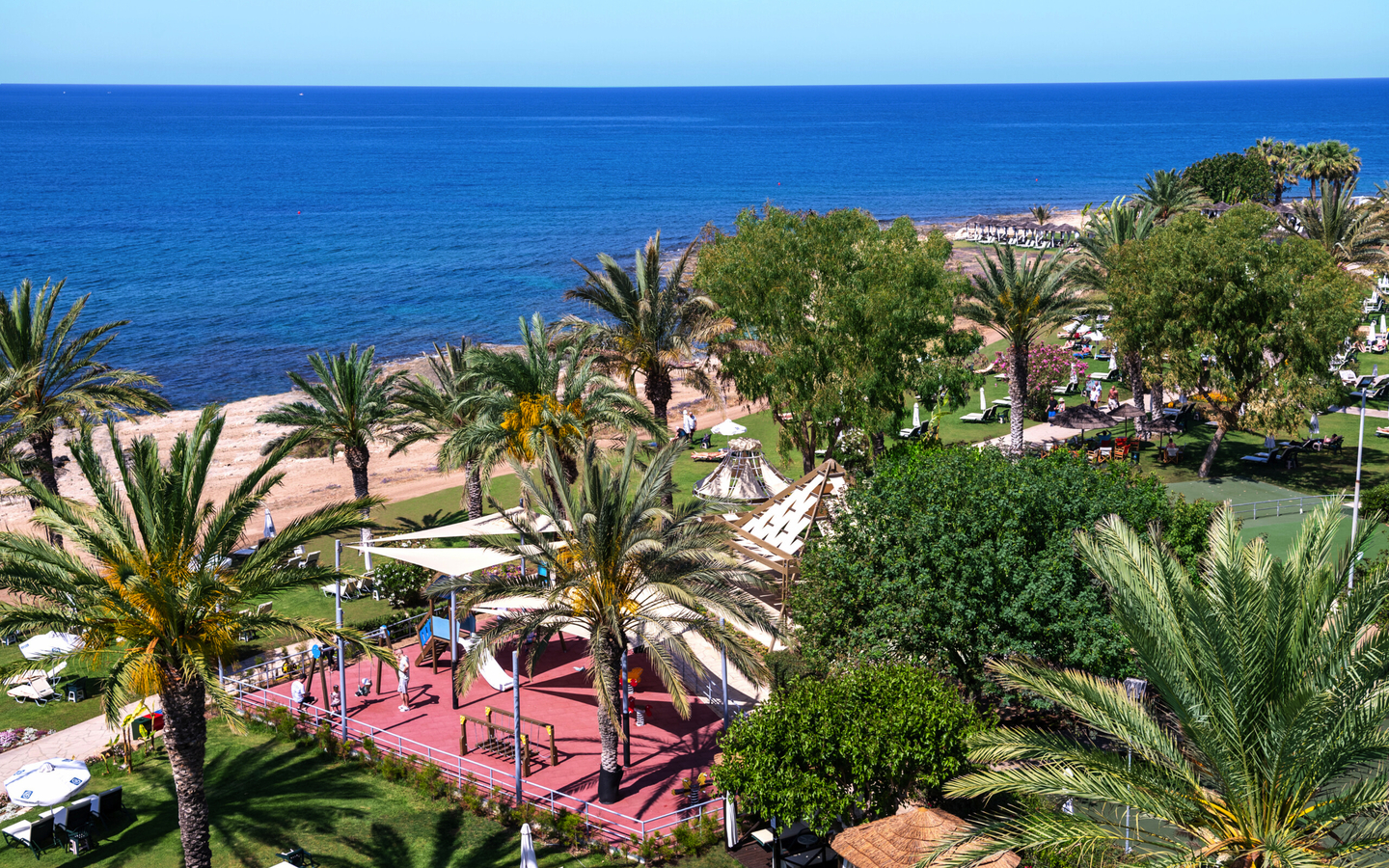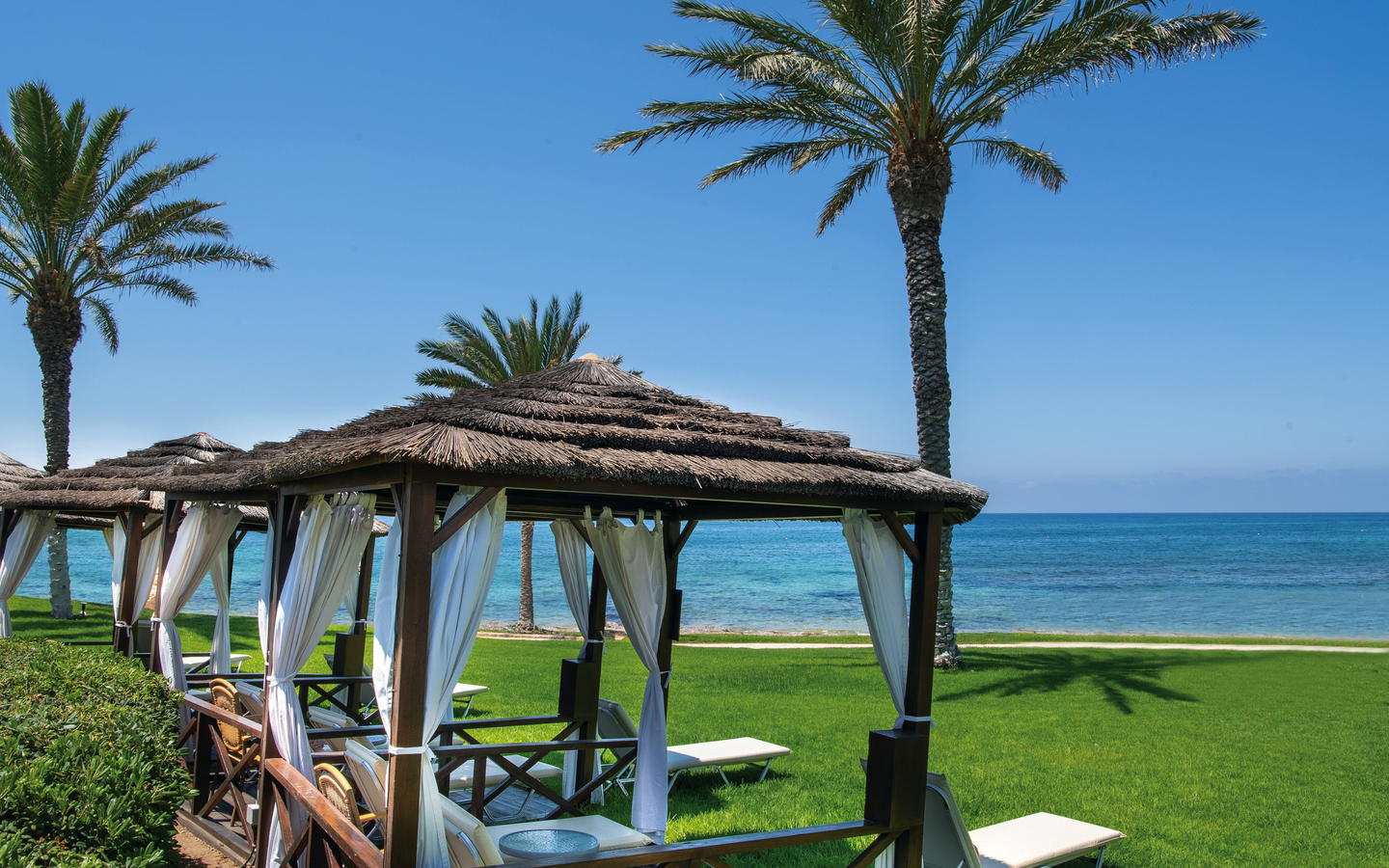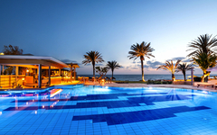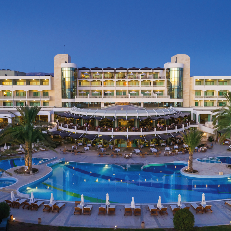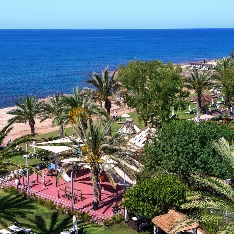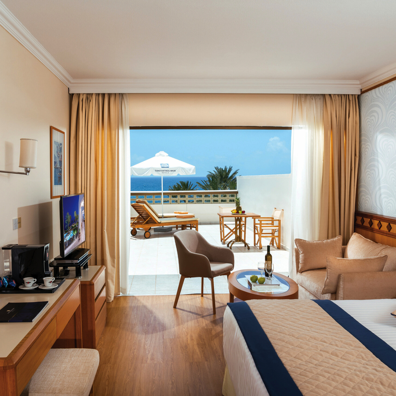 Das Hotel der bekannten Constantinou Bros Hoteliers ist sehr komfortabel und mit allen Annehmlichkeiten ausgestattet. Die Badebucht mit kleinem Strand (teilw. Felsen) und Steg grenzt unmittelbar an die schöne Gartenanlage.