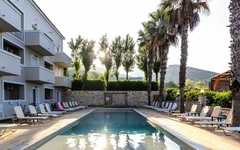 Im Außenbereich erwartet Sie ein Pool mit Liegen und Sonnenschirmen – ideal für entspannte Stunden unter der griechischen Sonne.