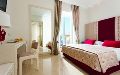 Stilvoll mit Bad oder Dusche/WC, Haartrockner, TV, Telefon, Klimaanlage, Minibar, Safe, Balkon und frontalem Meerblick.