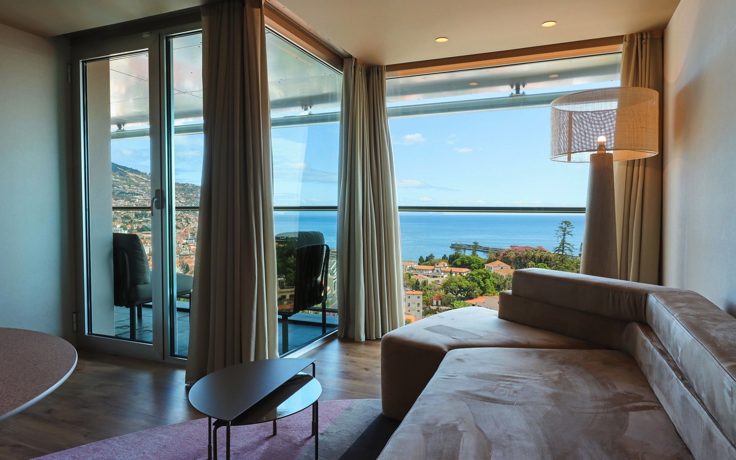 Moderne, komfortable Zimmer mit Bad oder Dusche/WC, Klimaanlage, TV und Balkon oder Terrasse. Die Zimmer haben eine Aussicht auf Funchal und die Berge von Madeira.