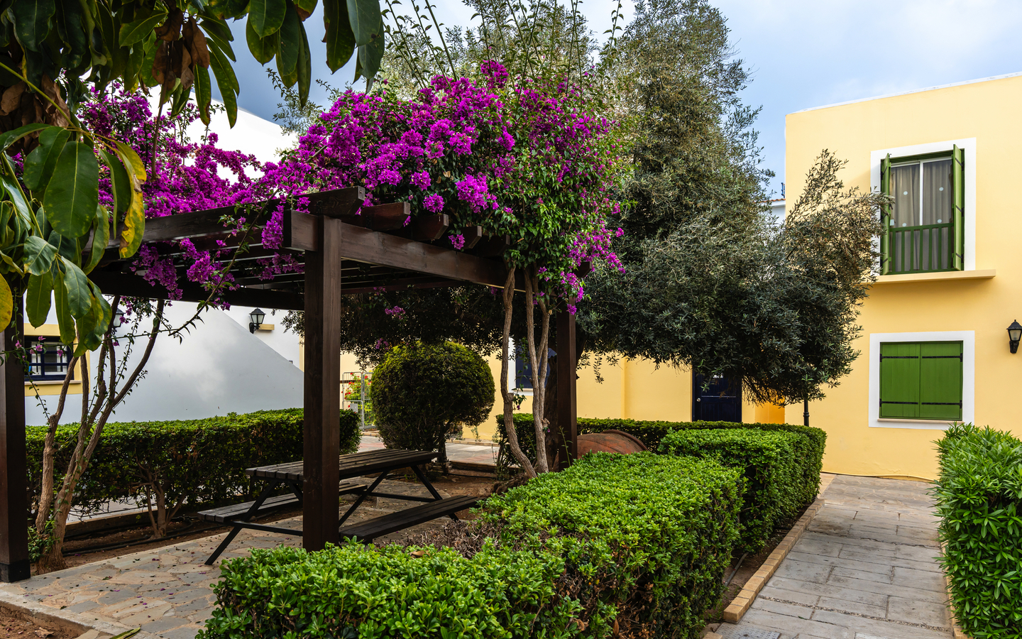 Die Anlage ist wie ein kleines Dorf gestaltet, mit gepflegten Gärten, niedrigen Gebäuden und viel Raum für Begegnung.
