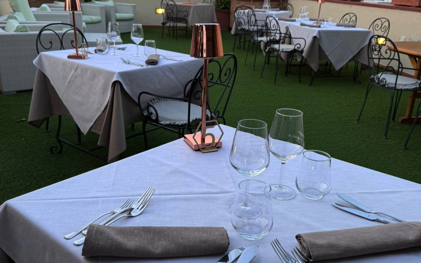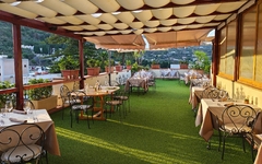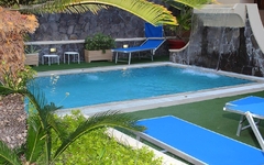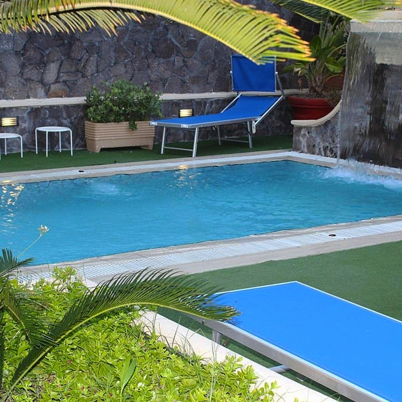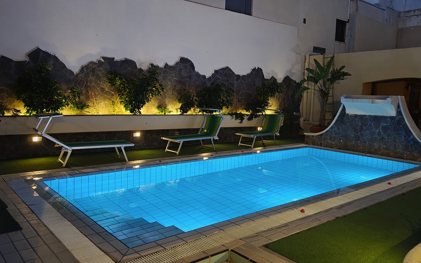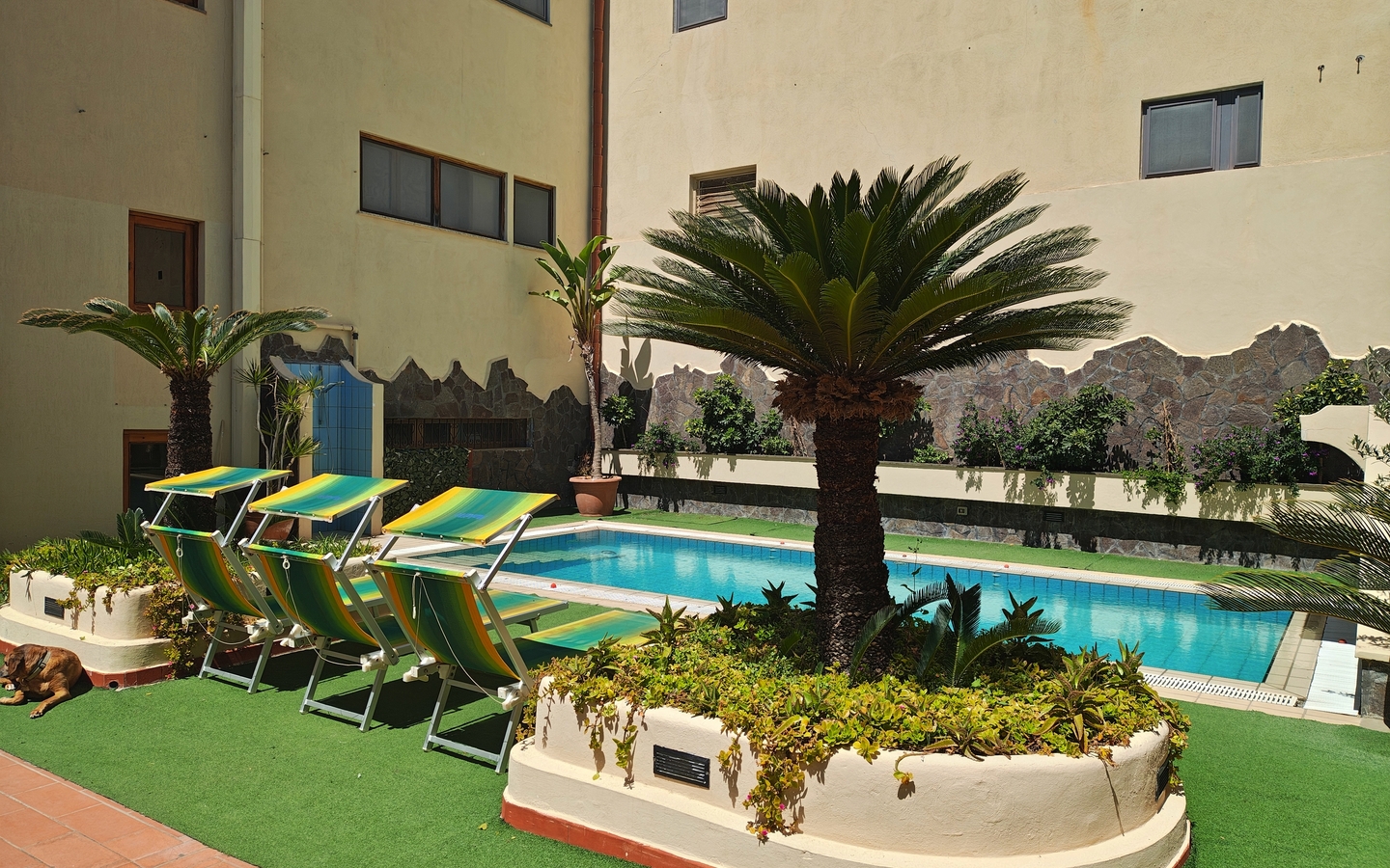 Das Hotel bietet einen kleinen Außenpool mit Whirlpoolfunktion (saisonal), eine Panoramaterrasse sowie einen gepflegten Garten mit Liegen.