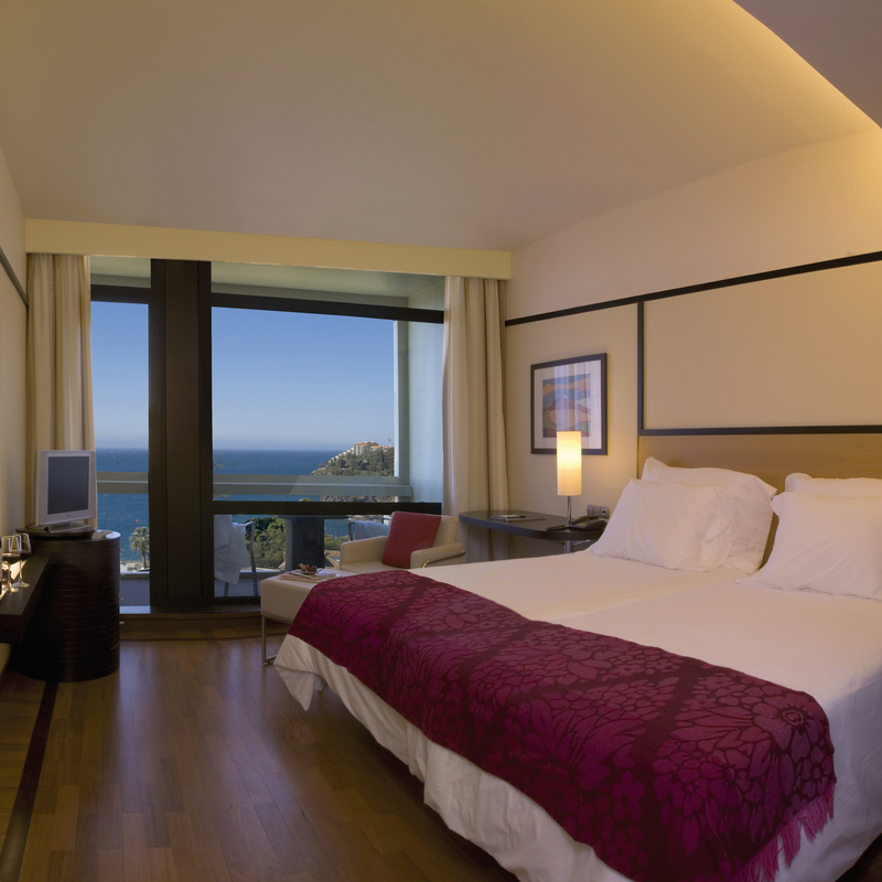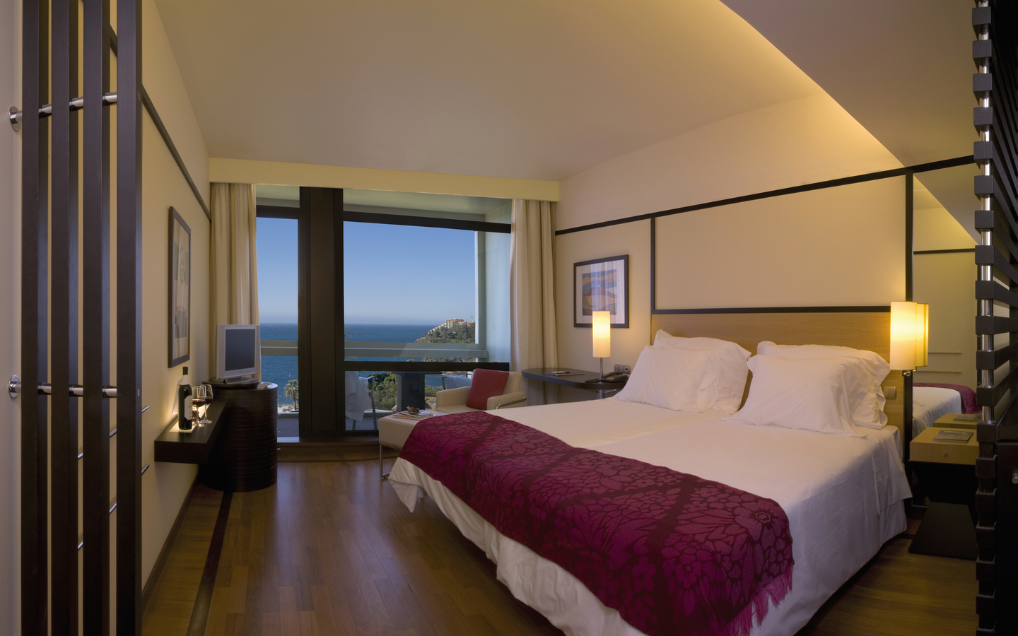Geräumige Zimmer mit Bad oder Dusche/WC, Klimaanlage, TV und Balkon oder Terrasse. Das Zimmer verfügt über seitlichen Blick auf das Meer.