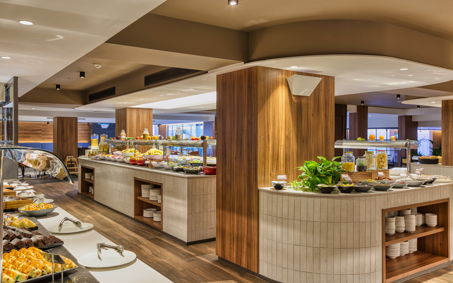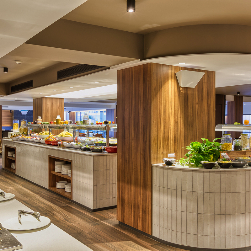 Das Hotel verfügt über drei Restaurants (Buffetrestaurant „Bellini“ und zwei À-la-carte-Restaurants – mediterran/italienisch bzw. lokale Fusionsküche) sowie mehrere Bars, darunter eine Panorama–Poolbar auf der Dachterrasse.