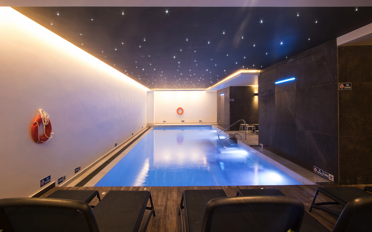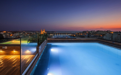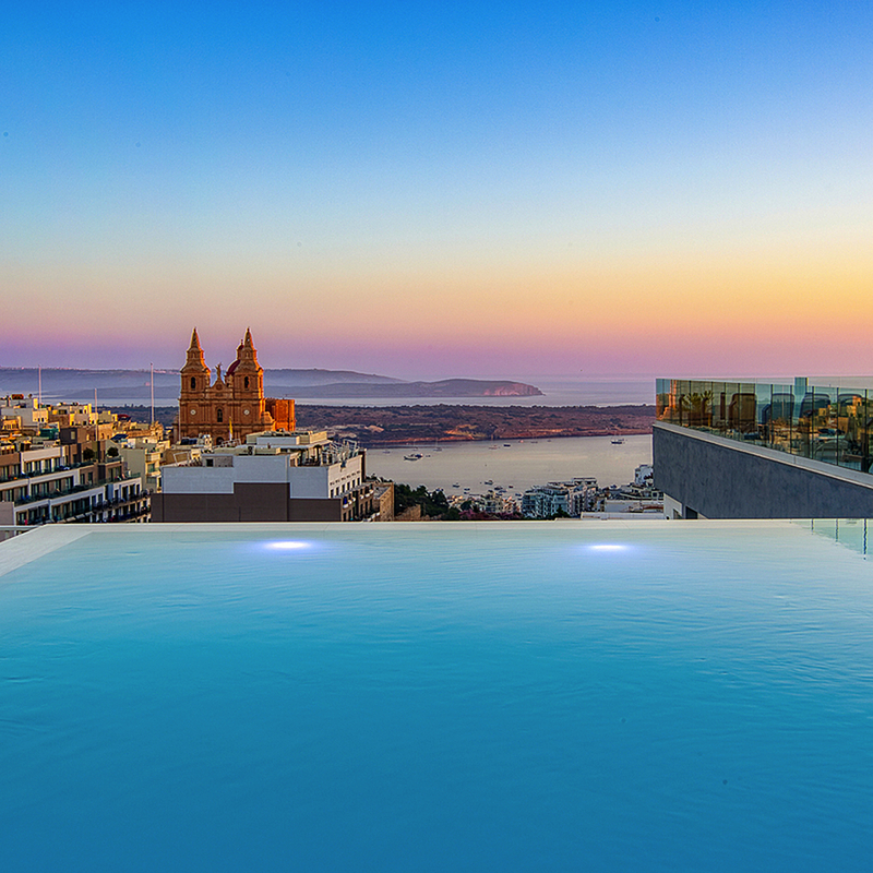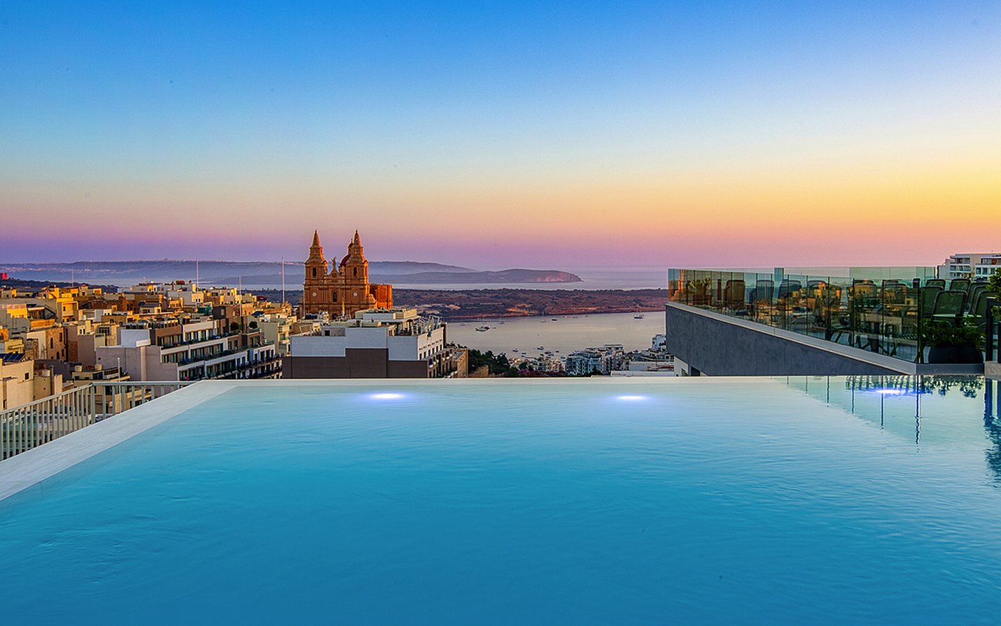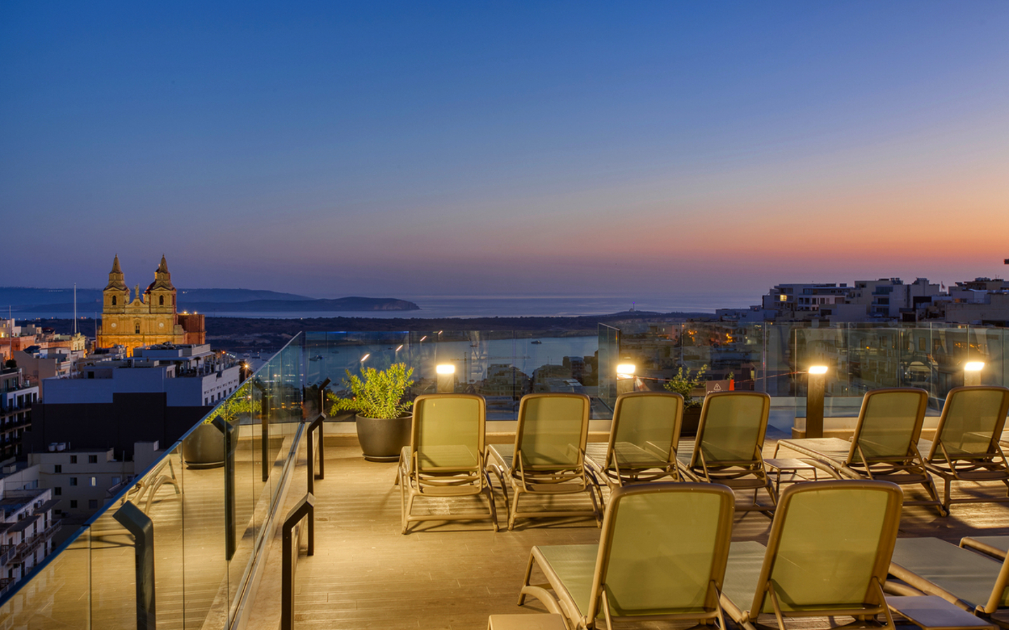 Die Rooftop-Terrasse mit Infinity-Pool, Swim-up-Bar, Liegen und Sonnenschirmen gewährt einen traumhaften Blick über Mellieħa Bay bis zu den Inseln Gozo und Comino. Ein innenliegender, beheizter Pool (in den Wintermonaten), ein Fitnessraum und ein Spa-Bereich mit Sauna, Whirlpool und Massageangebot runden das Angebot ab.